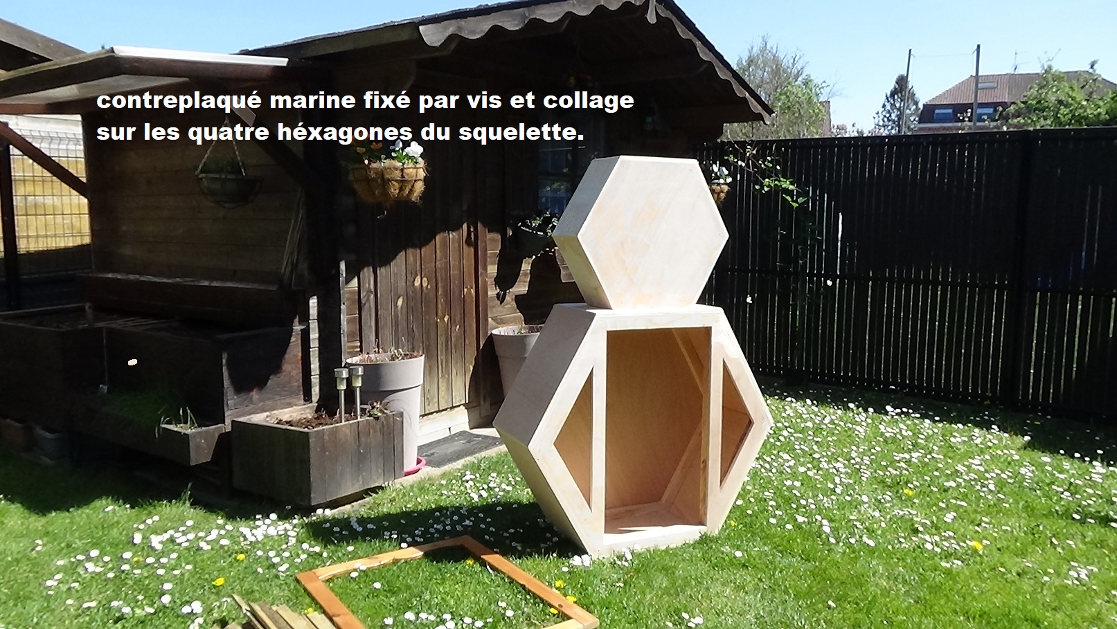 Je trace sur une grande feuille de papier un gabarit à l'échelle 1 pour construire le squelette et pour assembler correctement les pièces formant les 2 hexagones tête et corps de l'abeille. Pour recouvrir ce squelette de contreplaqué marine le gabarit est aussi idéal pour avoir des mesures précises. Pour rappel un hexagone = rayon x 6 sur la circonférence, j'ai choisi un rayon de 45 cm pour le corps et 26 cm pour la tête.